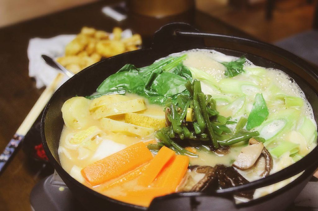 ほうとうを茹でる際は大きな土鍋で、3,4人がグループになってお召し上がり頂きます。茹で時間は10分ほど。その間にほうとうの具材も鍋に投入し、麺がなべ底で焦げないように注意します。完成まであと少しです。