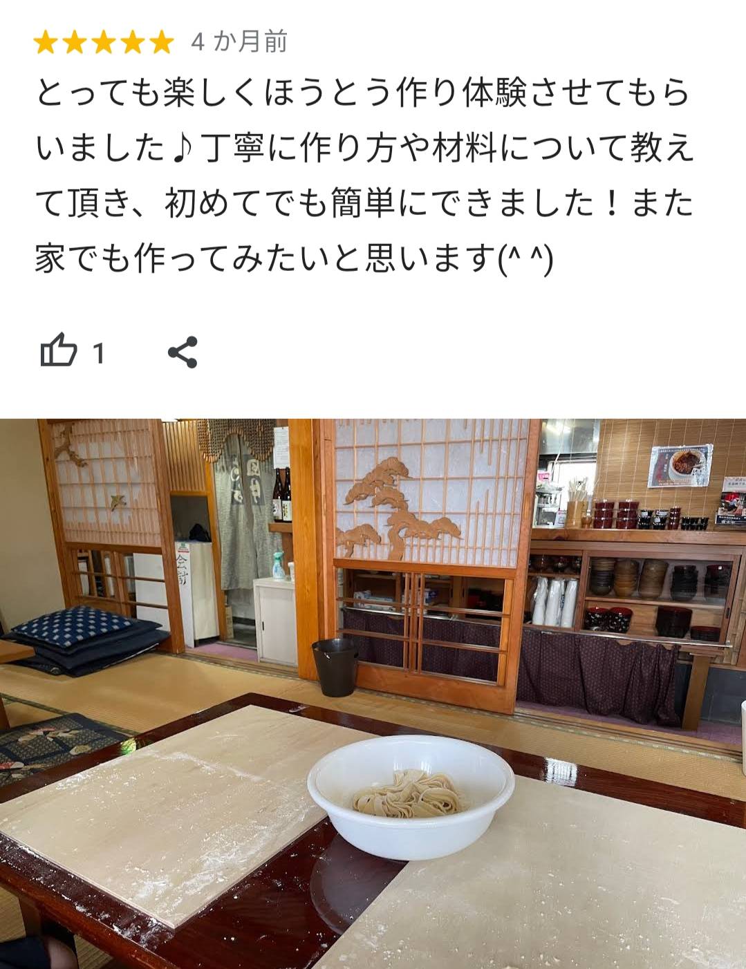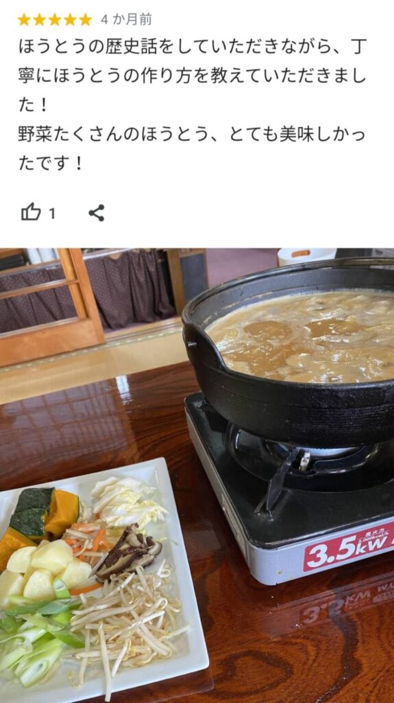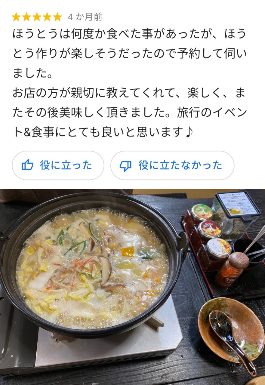 ほうとう作り体験にご参加頂いたお客様からの感想・レビューを一部ですがご紹介致します。